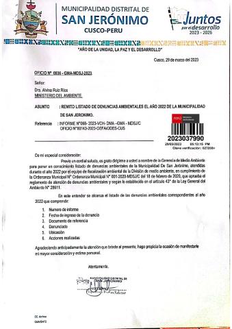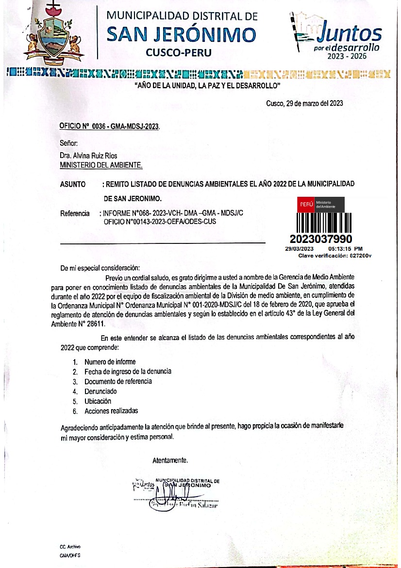 Listado de denuncias ambientales 2022 de la Municipalidad Distrital de San Jerónimo