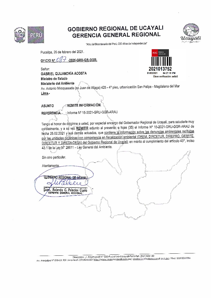 Listado sobre denuncias ambientales año 2020 del Gobierno Regional de Ucayali