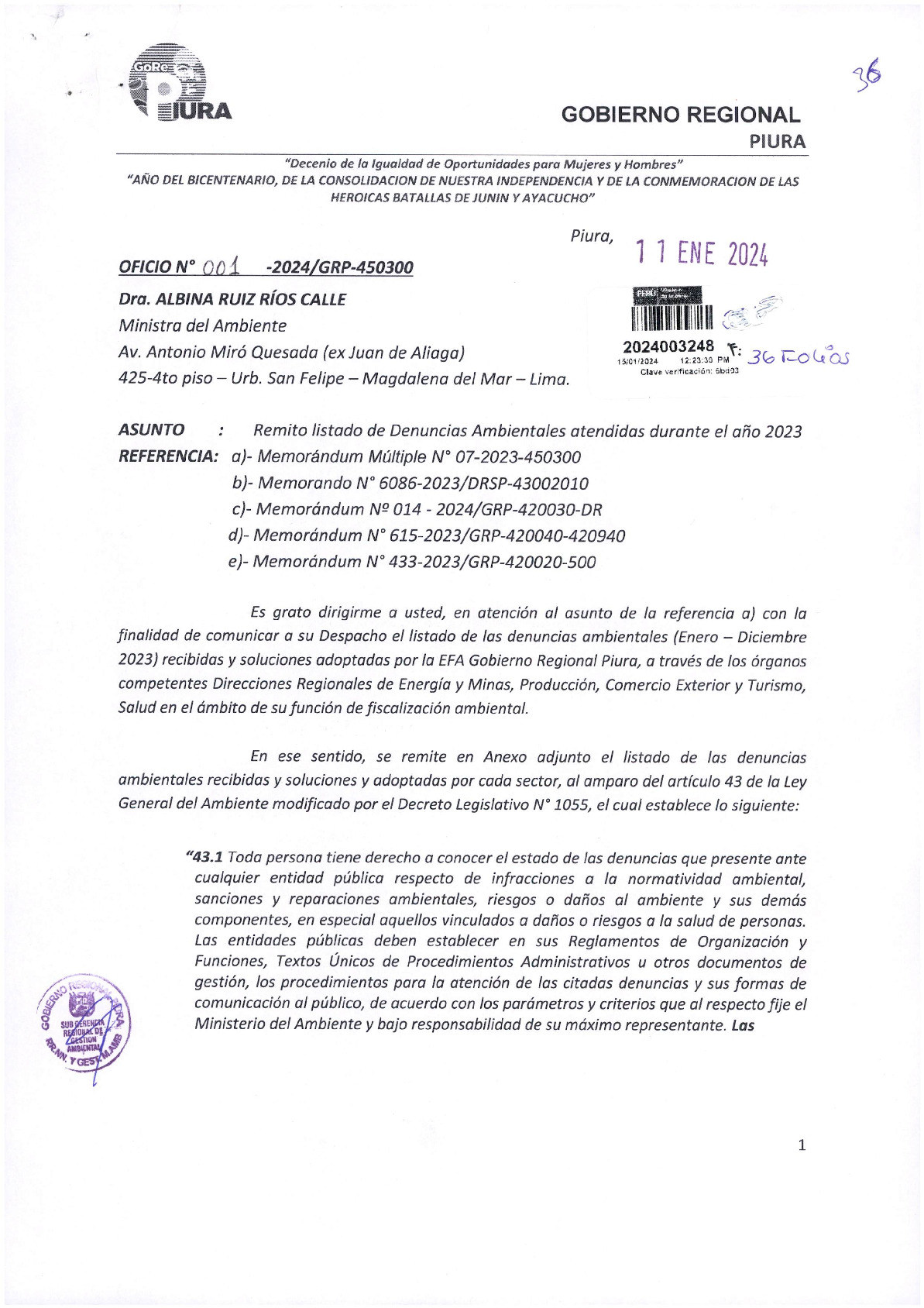 Listado de denuncias ambientales atendidas el 2023 por el Gobierno Regional de Piura