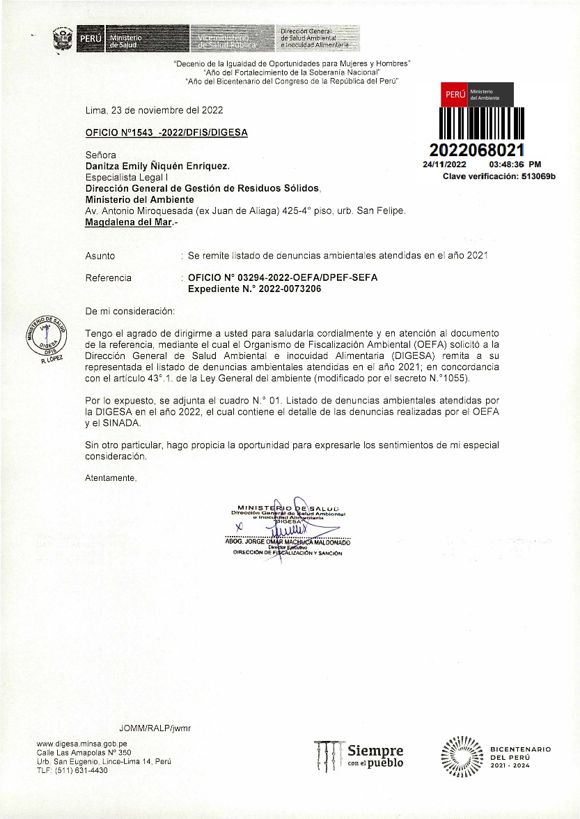Listado de denuncias ambientales emitidas el 2021 DIGESA