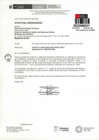 La entidad remite al Ministerio del Ambiente información sobre las denuncias ambientales en cumplimiento de lo establecido en el Decreto Legislativo N° 1055 que modifica el artículo 43° de la Ley N° 28611, que indica que "Las entidades deberán enviar anualmente un listado con las denuncias recibidas y soluciones alcanzadas, con la finalidad de hacer pública esta información a la población a través del SINIA".