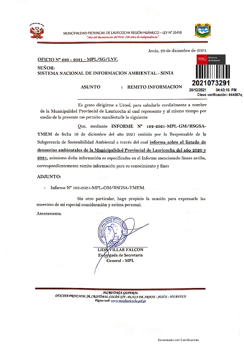 Listado de denuncias ambientales de la Municipalidad Provincial de Lauricocha del año 2020 y 2021