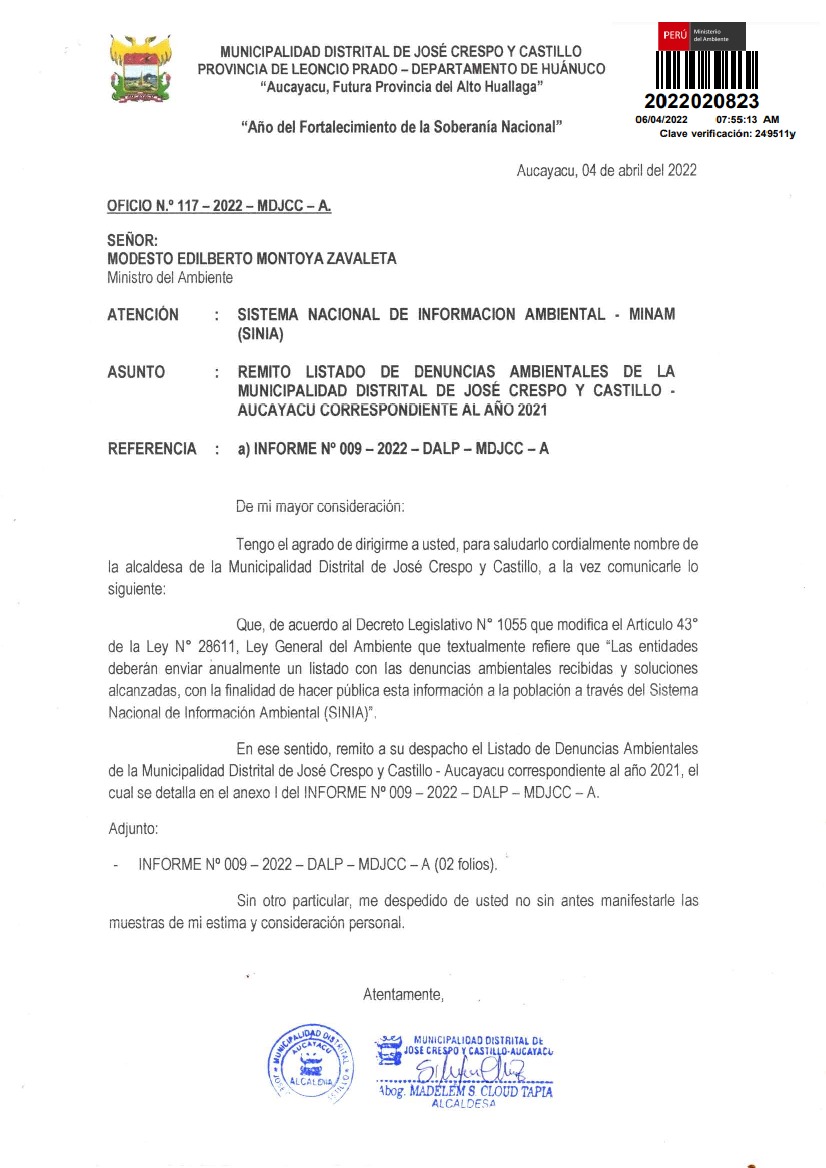 Listado de denuncias ambientales de la Municipalidad Distrital de José Crespo y Castillo - Aucayacu correspondientes al año 2021