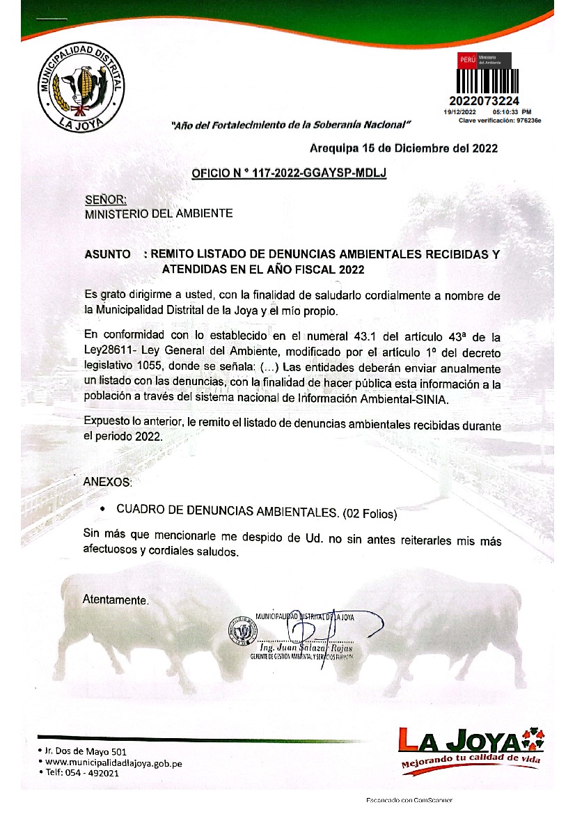 Listado de denuncias ambientales recibidas y atendidas en el año fiscal 2022 de la Municipalidad distrital de La Joya