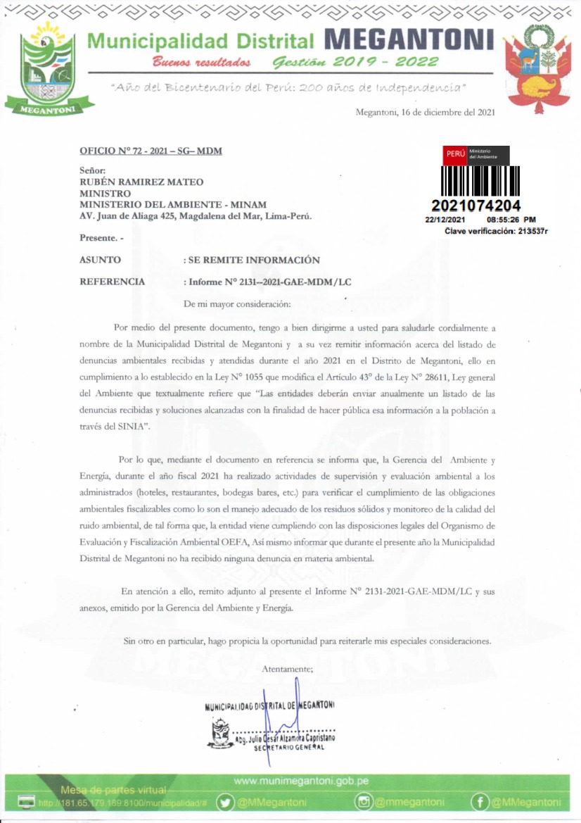 Listado de denuncias ambientales recibidas y atendidas durante el año 2021 en el Distrito de Megantoni