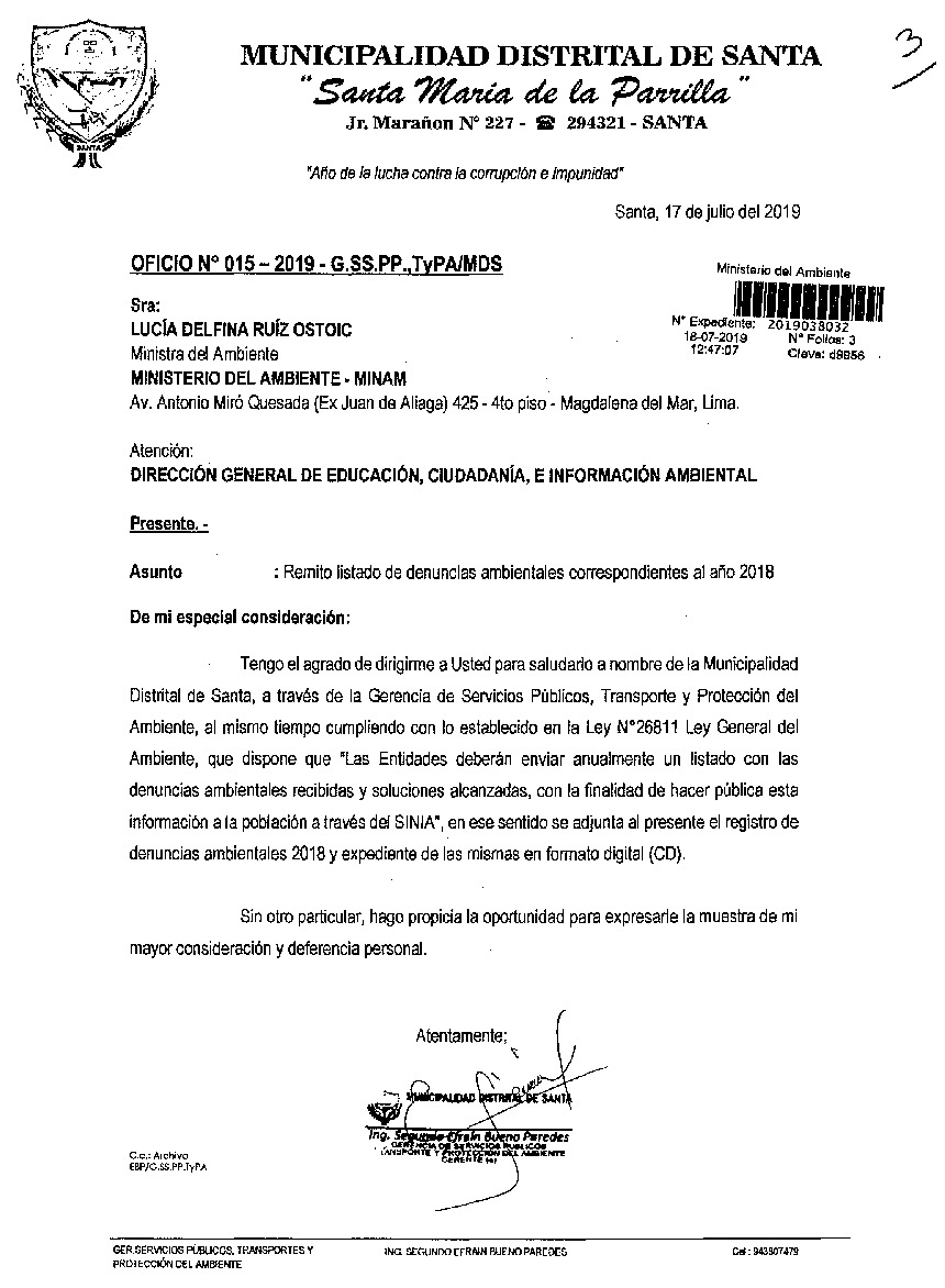 La Municipalidad Distrital del Santa remite al Ministerio del Ambiente información sobre las denuncias ambientales registradas por esta entidad correspondiente al año 2018, en cumplimiento de lo establecido en el Decreto Legislativo N° 1055 que modifica el artículo 43° de la Ley N° 28611, que indica que "Las entidades deberán enviar anualmente un listado con las denuncias recibidas y soluciones alcanzadas, con la finalidad de hacer pública esta información a la población a través del SINIA."