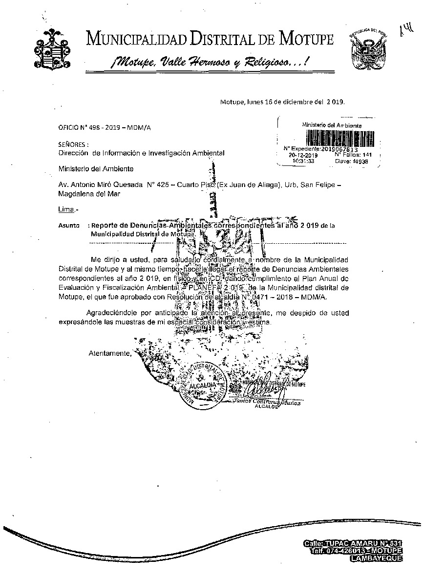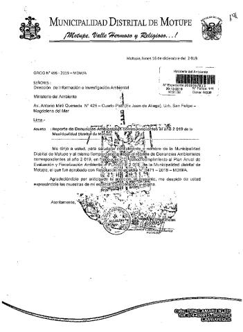 La Municipalidad Distrital de Motupe remite al Ministerio del Ambiente información sobre las denuncias ambientales registradas por esta entidad correspondiente al año 2019, en cumplimiento de lo establecido en el Decreto Legislativo N° 1055 que modifica el artículo 43° de la Ley N° 28611, que indica que "Las entidades deberán enviar anualmente un listado con las denuncias recibidas y soluciones alcanzadas, con la finalidad de hacer pública esta información a la población a través del SINIA".