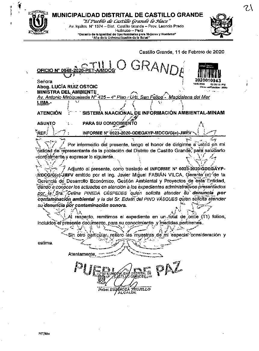 La Municipalidad Distrital de Castillo Grande remite al Ministerio del Ambiente información sobre las denuncias ambientales registradas por esta entidad correspondiente al año 2019, en cumplimiento de lo establecido en el Decreto Legislativo N° 1055 que modifica el artículo 43° de la Ley N° 28611, que indica que "Las entidades deberán enviar anualmente un listado con las denuncias recibidas y soluciones alcanzadas, con la finalidad de hacer pública esta información a la población a través del SINIA".