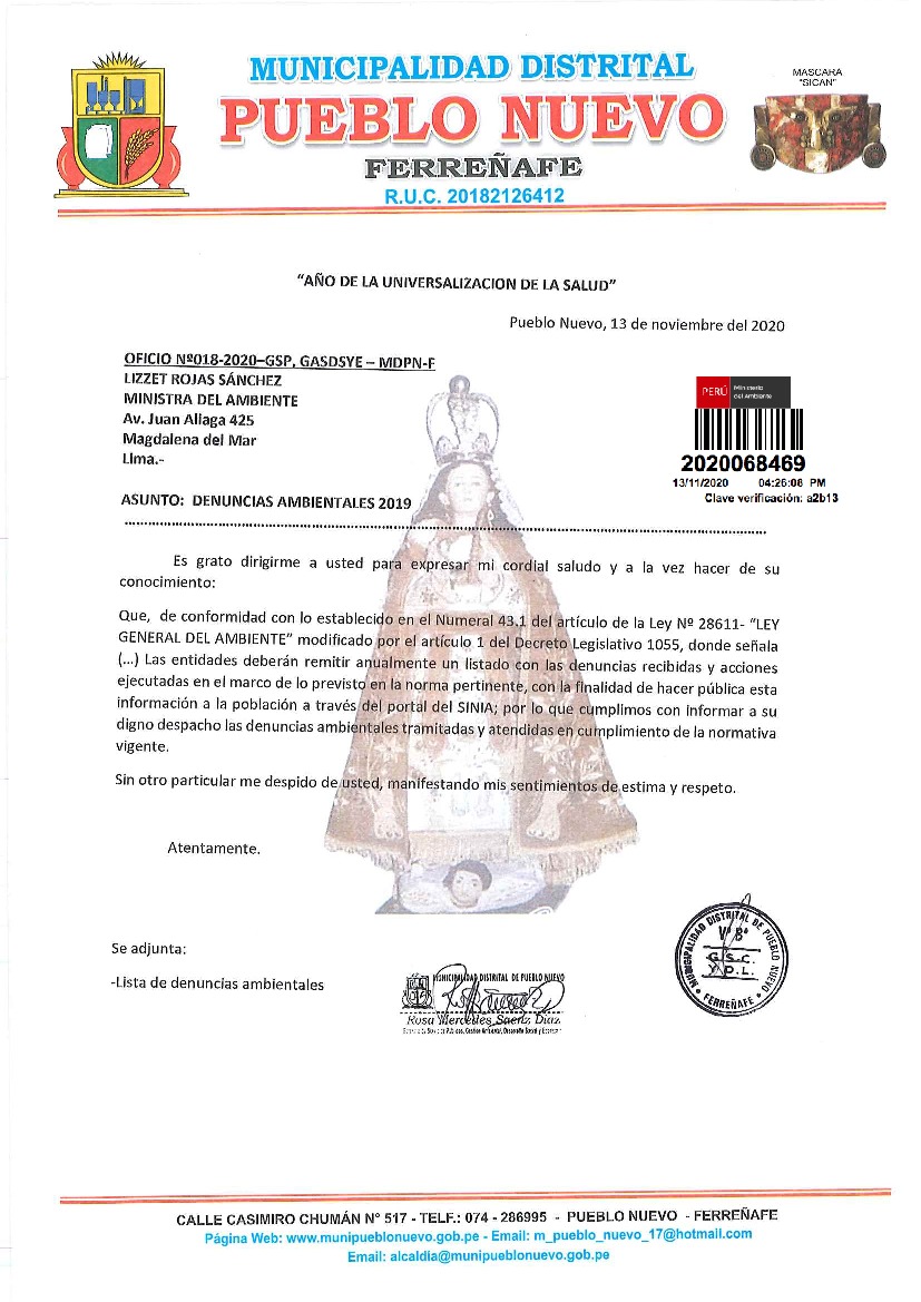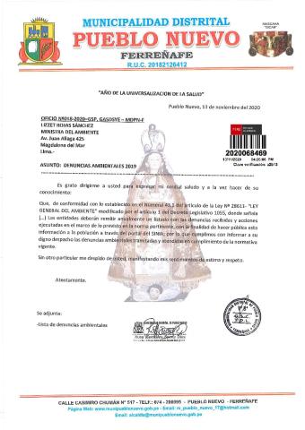 La Municipalidad Distrital de Pueblo Nuevo remite al Ministerio del Ambiente información sobre las denuncias ambientales registradas por esta entidad correspondiente al año 2019, en cumplimiento de lo establecido en el Decreto Legislativo N° 1055 que modifica el artículo 43° de la Ley N° 28611, que indica que "Las entidades deberán enviar anualmente un listado con las denuncias recibidas y soluciones alcanzadas, con la finalidad de hacer pública esta información a la población a través del SINIA".