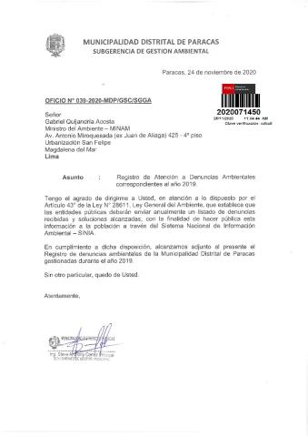La Municipalidad Distrital de Paracas remite al Ministerio del Ambiente información sobre las denuncias ambientales registradas por esta entidad correspondiente al año 2019, en cumplimiento de lo establecido en el Decreto Legislativo N° 1055 que modifica el artículo 43° de la Ley N° 28611, que indica que "Las entidades deberán enviar anualmente un listado con las denuncias recibidas y soluciones alcanzadas, con la finalidad de hacer pública esta información a la población a través del SINIA".