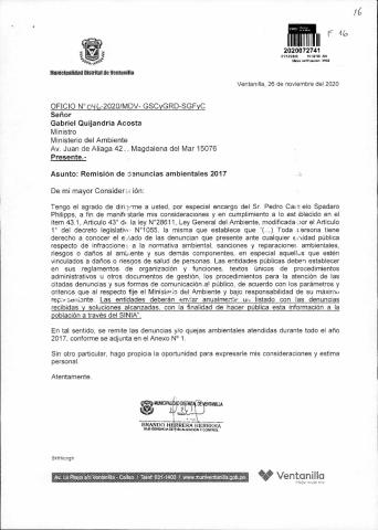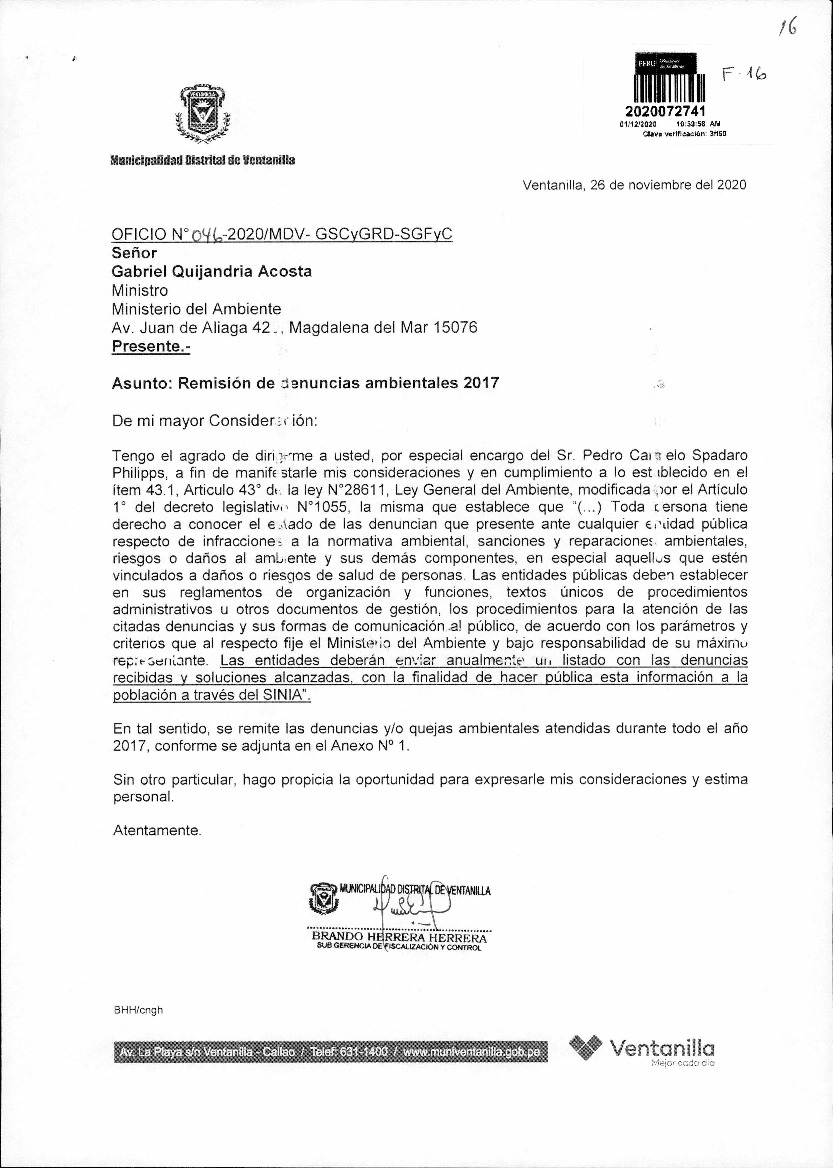 La Municipalidad Distrital de Ventanilla remite al Ministerio del Ambiente información sobre las denuncias y quejas ambientales registradas por esta entidad correspondiente al año 2017, en cumplimiento de lo establecido en el Decreto Legislativo N° 1055 que modifica el artículo 43° de la Ley N° 28611, que indica que "Las entidades deberán enviar anualmente un listado con las denuncias recibidas y soluciones alcanzadas, con la finalidad de hacer pública esta información a la población a través del SINIA".