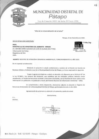 La Municipalidad Distrital de Patapo remite al Ministerio del Ambiente información sobre las denuncias ambientales registradas por esta entidad correspondiente al año 2020, en cumplimiento de lo establecido en el Decreto Legislativo N° 1055 que modifica el artículo 43° de la Ley N° 28611, que indica que "Las entidades deberán enviar anualmente un listado con las denuncias recibidas y soluciones alcanzadas, con la finalidad de hacer pública esta información a la población a través del SINIA".