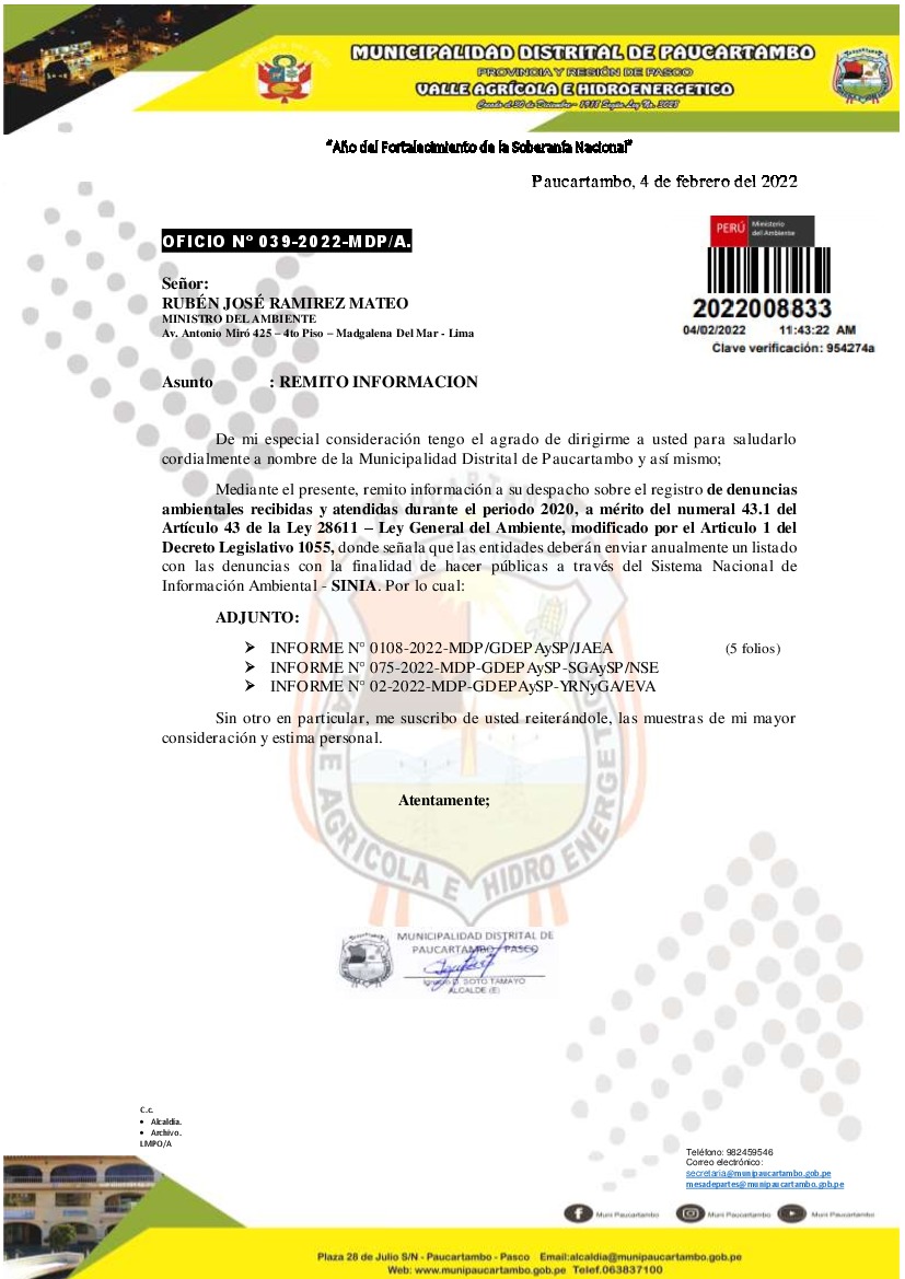La Municipalidad Distrital de Paucartambo remite al Ministerio del Ambiente información sobre las denuncias ambientales registradas por esta entidad correspondiente al año 2021, en cumplimiento de lo establecido en el Decreto Legislativo N° 1055 que modifica el artículo 43° de la Ley N° 28611, que indica que "Las entidades deberán enviar anualmente un listado con las denuncias recibidas y soluciones alcanzadas, con la finalidad de hacer pública esta información a la población a través del SINIA".