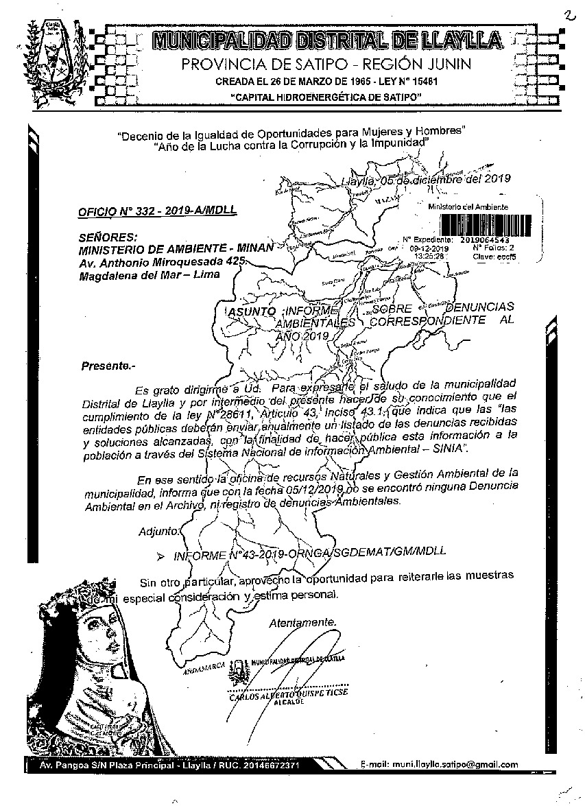 La Municipalidad Distrital de Llaylla remite al Ministerio del Ambiente información sobre las denuncias ambientales registradas por esta entidad correspondiente al año 2019, en cumplimiento de lo establecido en el Decreto Legislativo N° 1055 que modifica el artículo 43° de la Ley N° 28611, que indica que "Las entidades deberán enviar anualmente un listado con las denuncias recibidas y soluciones alcanzadas, con la finalidad de hacer pública esta información a la población a través del SINIA".