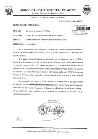La Municipalidad Distrital de Aczo remite al Ministerio del Ambiente información sobre las denuncias ambientales registradas por esta entidad correspondiente al año 2019, en cumplimiento de lo establecido en el Decreto Legislativo N° 1055 que modifica el artículo 43° de la Ley N° 28611, que indica que "Las entidades deberán enviar anualmente un listado con las denuncias recibidas y soluciones alcanzadas, con la finalidad de hacer pública esta información a la población a través del SINIA".