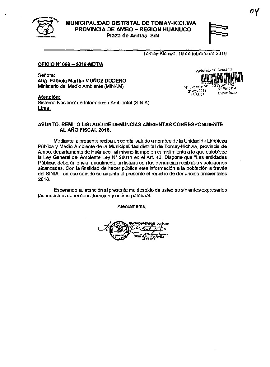LISTADO DE DENUNCIAS AMBIENTAS CORRESPONDIENTE AL AÑO FISCAL 2018 - MUNICIPALIDAD DISTRITAL DE TOMAY-KICHWA