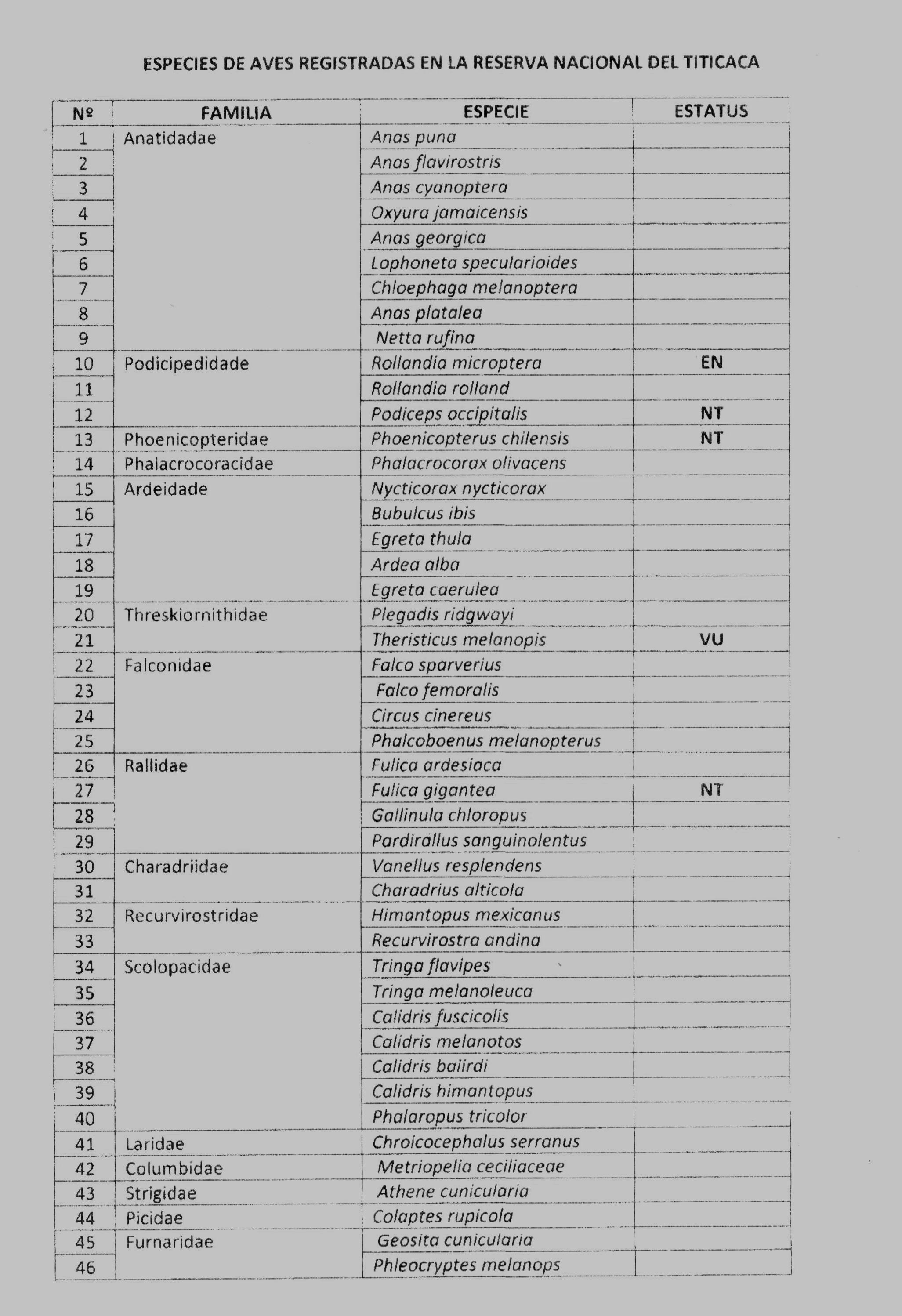 Listado de Especies de aves registradas en el ámbito de la Reserva Nacional del Titicaca.
