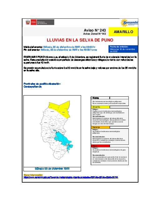 AVISO METEOROLOGICO DE LLUVIAS EN LA SELVA DE PUNO, PARA EL SABADO 03 DE DICIEMBRE 2022.