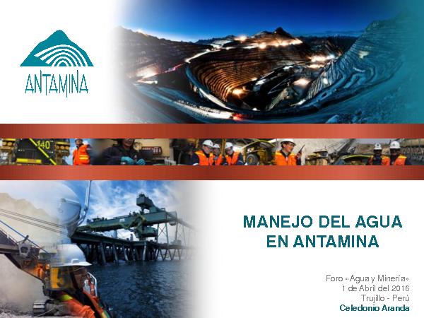 Esta presentación fue realizada por Celedonio Aranda de Antamina en el Foro “Agua y Minería”, que tuvo como objetivo de proyectar un ambiente de análisis, discusión y conceso, en temas de cómo es que la minería aprovecha los recursos hídricos y el proceso. Este foro fue organizado por el Ministerio de Agricultura y Riego (MINAGRI), la Autoridad Nacional del Agua (ANA), y la Gerencia Regional de Energía, Minas e Hidrocarburo los días 31 de Marzo y 01 de Abril del 2016 en el Auditorio del Colegio de Ingenieros de La Libertad.