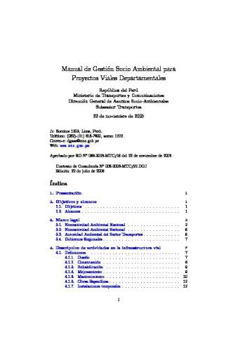 El presente Manual de Gestión Socio Ambiental para Proyectos Viales, contiene las especificaciones y consideraciones ambientales para la gestión de la red vial departamental, así como, para la existente en los diferentes ecosistemas del país. El manual ha sido concebido teniendo en cuenta un enfoque sistémico, e integral, sobre los efectos generados durante el proceso de diseño, construcción, mejoramiento, rehabilitación y mantenimiento de las vías sobre el medio físico, biológico, socio económico y cultural, y a su vez como las relaciones funcionales del medio y las actividades antrópicas pueden incidir sobre las condiciones de la vía. Las vías articulan no solo el desarrollo económico y social, sino que constituyen un instrumento fundamental de ordenamiento territorial, consiguientemente su gestión socio ambiental es un tema de vital importancia.