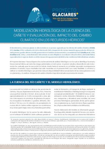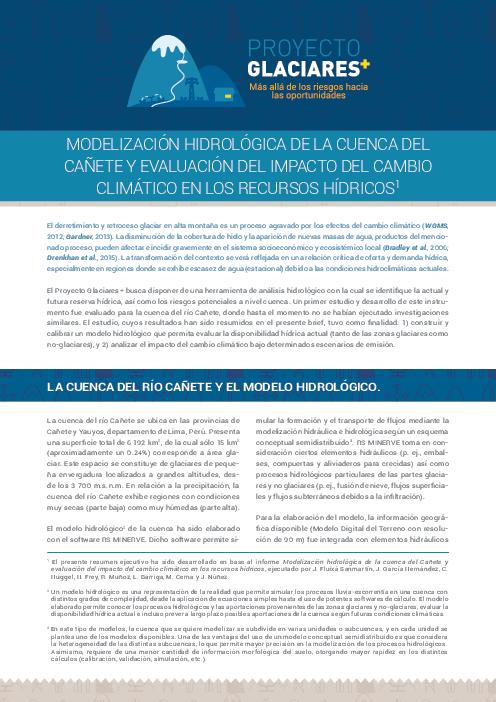 El Proyecto Glaciares+ busca disponer de una herramienta de análisis hidrológico con la cual se identifique la actual y futura reserva hídrica, así como los riesgos potenciales a nivel cuenca. Un primer estudio y desarrollo de este instrumento fue evaluado para la cuenca del río Cañete, donde hasta el momento no se habían ejecutado investigaciones similares. El estudio, cuyos resultados han sido resumidos en el presente brief, tuvo como finalidad: 1) construir y calibrar un modelo hidrológico que permita evaluar la disponibilidad hídrica actual (tanto de las zonas glaciares como no-glaciares), y 2) analizar el impacto del cambio climático bajo determinados escenarios de emisión.
