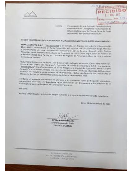 MODIFICACIÓN DEL CRONOGRAMA Y ACTUALIZACIÓN DE LA GARANTÍA FINANCIERA DEL PLAN DE CIERRE DE MINA DEL EIAsd DEL PROYECTO DE EXPLORACIÓN “PUCARUMI”