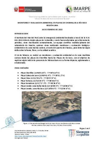 MONITOREO Y EVALUACION AMBIENTAL EN PLAYAS DE CHORRILLOS A RÍO SECO REGIÓN LIMA 16 DE FEBRERO DE 2022