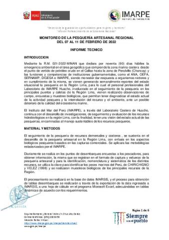 Mediante la R.M. 021-2022-MINAN que declara por noventa (90) días hábiles la emergencia ambiental en el área geográfica que comprende la zona marina costera desde el punto de vertido de petróleo crudo en el Callao hasta la zona de Peralvillo (Chancay) y las funciones y competencias de instituciones gubernamentales, como el ANA, OEFA, SERNAMP, DIGESA e IMARPE, siendo menester dar respuesta a organismos rectores y en cumplimiento de la misma, se vienen generando semanalmente reportes del estado situacional la pesquería en la Región Lima, para lo cual el personal profesionales del Laboratorio de IMARPE Huacho, involucrado en el seguimiento de la pesquería en los principales puertos y caletas de la Región Lima, vienen realizando observaciones de campo, encuestas y muestreo biológicos, que permitan tener diagnosticar el estado actual de la actividad pesquera y la interrelación del recurso y el ambiente, ante un posible deterioro de la calidad del ecosistema marino.