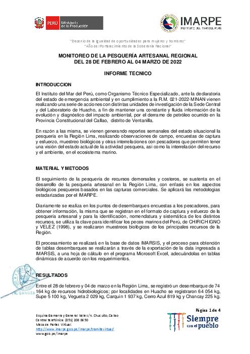 El Instituto del Mar del Perú, como Organismo Técnico Especializado, ante la declaratoria del estado de emergencia ambiental y en cumplimiento a la R.M. 021-2022-MINAN vienen realizando una serie de acciones con distintas unidades de investigación de la Sede Central y del Laboratorio de Huacho, a fin de mantener una constante y fluida información de la evolución y diagnóstico del impacto ambiental, por el derrame de petróleo ocurrido en la Provincia Constitucional del Callao, distrito de Ventanilla.