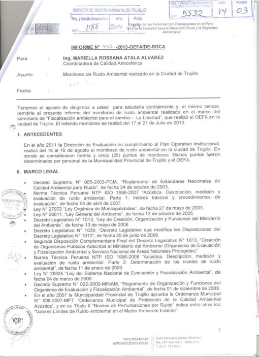 El Organismo de Evaluación y Fiscalización Ambiental-OEFA realizó en la ciudad de Trujillo del 17 al 21 de julio del 2013 el monitoreo de ruido ambiental en horario diurno en un total de treinta y cuatro (34) puntos. Es preciso mencionar que se consideraron los puntos monitoreados en el año 2011. Los cuales fueron determinados por el personal de la Municipalidad Provincial de Trujillo, quienes eligieron para la medición a las zonas con mayor tránsito vehicular. Cabe resaltar que la citada evaluación se realizó en los distritos de La Esperanza, El Porvenir, Huanchaco y Trujillo.