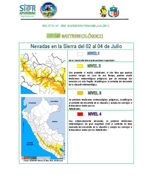 El SENAMHI, organismo adscrito al Ministerio del Ambiente, informa que desde el día 2 al 4 de Julio se prevé precipitaciones sólidas (nieve) en la sierra central y sur del país en localidades por encima de los 4300 msnm. Así mismo, se espera precipitaciones sólidas (granizo) en forma aislada en localidades comprendidas entre los 3000-4300 msnm.