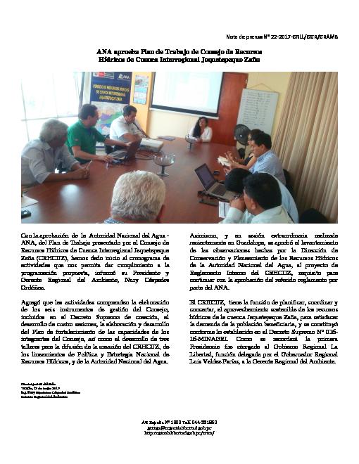 Nota de prensa N° 22 ANA aprueba Plan de Trabajo de Consejo de Recursos Hídricos de Cuenca Interregional Jequetepeque Zaña