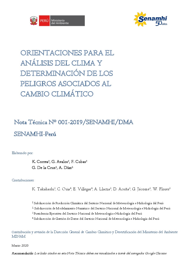 La presente nota técnica tiene como objeto brindar un marco conceptual que oriente el análisis del clima y la determinación de los peligros hidrometeorológicos y ambientales asociados al cambio climático, Determinar los peligros hidrometeorológicos asociados a los cambios en el promedio del clima y de la variabilidad climática como parte del clima actual y futuro, y Describir las herramientas y/o los procedimientos para la caracterización del clima actual y futuro a nivel local, regional y nacional en el marco de la implementación de medidas de adaptación al cambio climático, proyectos de intervención, programas presupuestales u otros.