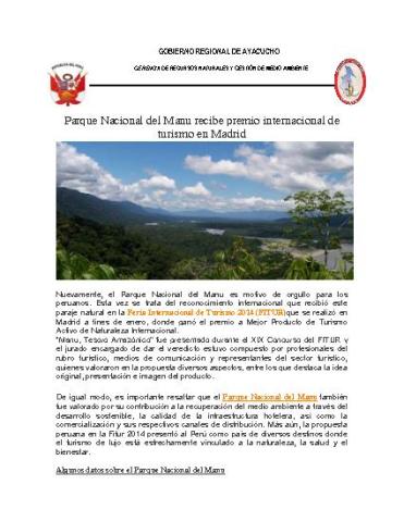 Nuevamente, el Parque Nacional del Manu es motivo de orgullo para los peruanos. Esta vez se trata del reconocimiento internacional que recibió este paraje natural en la Feria Internacional de Turismo 2014 (FITUR)que se realizó en Madrid