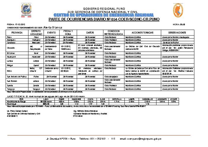 PARTE DE OCURRENCIAS DIARIO Nº 054 - CENTRO DE EMERGENCIAS REGIONALES - SUB GERENCIA DE DEFENSA NACIONAL Y CIVIL