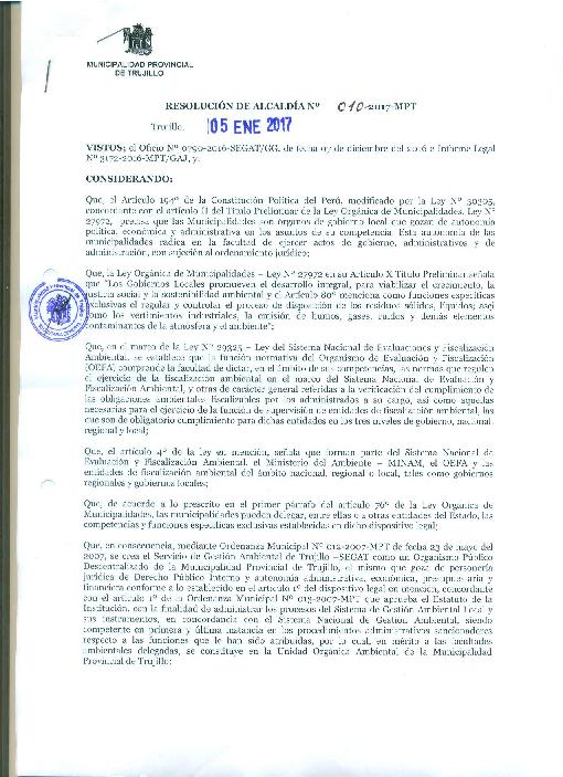 Plan Anual de Evaluación y Fiscalización Ambiental - PLANEFA para el año 2017 de la Municipalidad Provincial de Trujillo