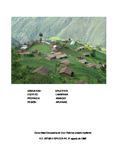 PRESENTACIÓN La comunidad de Cruz Pata se encuentra ubicada a 35 km de la capital del distrito de Lambrama cuenta con una variedad de micro climas, que ayudan a generar una biodiversidad favorable, lo cual se convierte en una fortaleza para poder aprovechar estos recursos, el anhelo de los comuneros es desarrollar un plan de desarrollo a corto, mediano y largo plazo. La labor del PIP Comunal como ente facilitador y encargado de esta tarea en particular, ha sido la de esclarecer los sueños de los comuneros y articularlos en un visión mayor, es decir fortalecer a nivel de la organización. No ha sido una tarea difícil, puesto que la mayoría de los comuneros participantes en el proceso han reconocido la importancia de este trabajo como una dinámica organizacional actual y los estilos de negociación con el gobierno Local, y Regional.