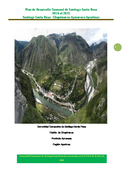 PRESENTACION Nuestra comunidad cuenta con el centro poblado Santa Rosa que tiene una dinámica muy distinta a la de Santiago, esta situación dificulta nuestra organización y la planificación de nuestro desarrollo, somos una comunidad privilegiada por tener el mejor clima y accesibilidad a las ciudades más importantes del país. Actualmente estamos aprovechando estas condiciones comercializando nuestras frutas y animales menores. En este contexto comenzamos a desarrollar nuestro plan de desarrollo comunal, con la participación de todos los comuneros y comuneras con el apoyo del gobierno regional a través del proyecto: Mejoramiento de la Gestión Comunal para el Desarrollo de la Actividad Forestal en 20 Microcuencas y 04 Subcuencas de la Región de Apurímac, este proyecto es parte del Programa Sacha Tarpuy que se ejecuta en 266 comunidades de la región Apurímac. En este documento esta detallado nuestros problemas en los diferentes ejes que comprende este plan de desarrollo, también hemos identificado y priorizado acciones e ideas de proyectos que lo concretizaremos aprovechando los espacios como el Presupuesto Participativo distrital, provincial y regional. Asimismo nos acercaremos a las organizaciones no gubernamentales para que nos apoyen con el cumplimiento de nuestro plan y lograr el bienestar de los comuneros.