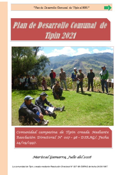 NTRODUCCIÓN La comunidad de Tipin, es parte del distrito de Mariscal Gamarra, ubicada en la “Quebrada Ollabamba”. Las áreas territoriales de la comunidad cuentan con potencial favorable productivamente, pero en la actualidad, se encuentra inmerso en la pobreza a pesar de contar con abundantes suelos cultivables, agua y piso ecológico que es apropiado para la agricultura, ganadería; sin embargo, las dificultades en cuanto a la inadecuada explotación de recursos, débil organización y falta de conclusión de la carretera Tipin – Llaullipata - Palpacachi, condicionan una comunidad aún postergada y aislada. Por ello, es necesario iniciar una gestión planificada de sus acciones y proyectos que mejoren las condiciones socio económicas a corto, mediano y largo plazo; por ello es oportuno elaborar el presente Plan de Desarrollo Comunal al 2021, con la adecuada identificación de acciones, proyectos y programas por ejes estratégicos, teniendo en cuenta las propias limitaciones y potencialidades hasta el año 2021.