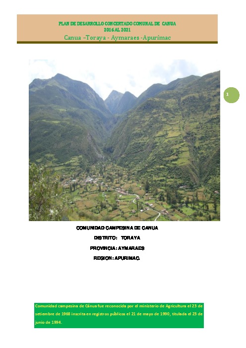 PRESENTACIÓN Nuestra comunidad campesina de Cánua es una de las 04 comunidades campesinas del distrito de Toraya de la provincia de Aymaraes de la región Apurímac, nuestros territorios se encuentran ubicadas en la parte media del distrito de Toraya, cuenta con recursos naturales como, bosques, pastos, manantiales, ríos, aves, animales, tiene un clima templado a frió y suelos fértiles. Por ello este plan de desarrollo comunal concertado hemos elaborado por que creemos que haciendo uso, de este importante instrumento de gestión que la comunidad tiene que hacer encaminar y que nos permitirá mejorar nuestro desempeño institucional como comunidad quien nos orientara hacia nuestro desarrollo sostenible comunal que nos permita alcanzar en un corto, mediano, largo plazo nuestros deseos ansiados.