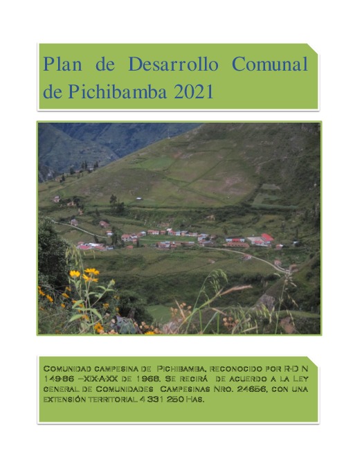 PRESENTACIÓN La comunidad Campesina de Pichibamba, está ubicado en el distrito de Mariscal Gamarra de la Provincia de Grau, forma parte una de las 11 comunidades reconocidas del distrito, reconocido por R-D N 149-86 –XIX-A-XX de 1968. Se regirá de acuerdo a la Ley general de Comunidades Campesinas Nro. 24656, con una extensión territorial 4 331 250 Has. Es una comunidad con oportunidades y condiciones geográficas moderadamente accidentada, la comunidad cuenta con terrenos cultivables y de forestación, Ubicado cercano a la capital del distrito, al pie de la trocha carrozable entre Abancay – Mariscal Gamarra (Palpacachi) – .Pichibamba Estas Condiciones generan la oportunidad de desarrollo que hasta hoy no ha sido aprovechado.
