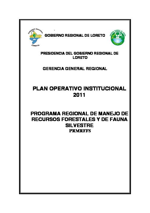 El presente Plan Operativo Institucional 2011 como herramienta de gestión nos permitirá orientar, monitorear y evaluar las actividades previstas en la propuesta operativa del Programa Regional de Manejo de Recursos Naturales y Fauna Silvestre, correspondientes a las tareas para el año 2011; consecuentemente se logrará los objetivos y metas propuestas que nos conlleven a la buena administración y gestión sostenible de los recursos forestales y de fauna silvestre.