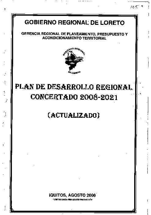 El Plan de Desarrollo Regional Concertado 2008 - 2021, se ha Actualizado mediante un proceso de planificación Estrategica Participativa Concertada, el cual ha permitido recoger las potencialidades, visión de futuro y aspiraciones de la población e instituciones públicas y privadas de la Región, para construir de modo colectivo un instrumento de orientación para impulsar el desarrollo sostenible de la Región Loreto