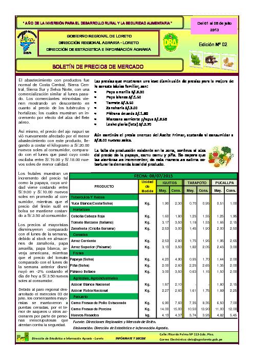 El presente boletín nos muestra el analisis de la,situación actual de los precios de mercado correspondiente a los centros de expendio de la ciudad de Iquitos.