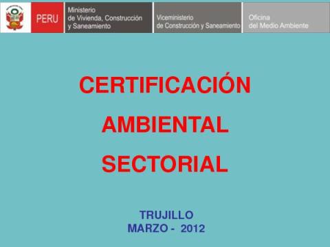 Esta presentación se desarrolló en el Seminario Taller "Gestión Ambiental Sectorial" , que se llevó cabo el 29 de marzo del 2012. El evento fue organizado por la Oficina de Medio Ambiente del Ministerio de Vivienda, Construcción y Saneamiento y en coordinación con la Gerencia Regional de Vivienda, Construcción y Saneamiento de La Libertad. Este evento tuvo como objetivo general fortalecer capacidades de funcionarios y personal del gobierno regional, gobiernos locales e Instituciones públicas y privadas.