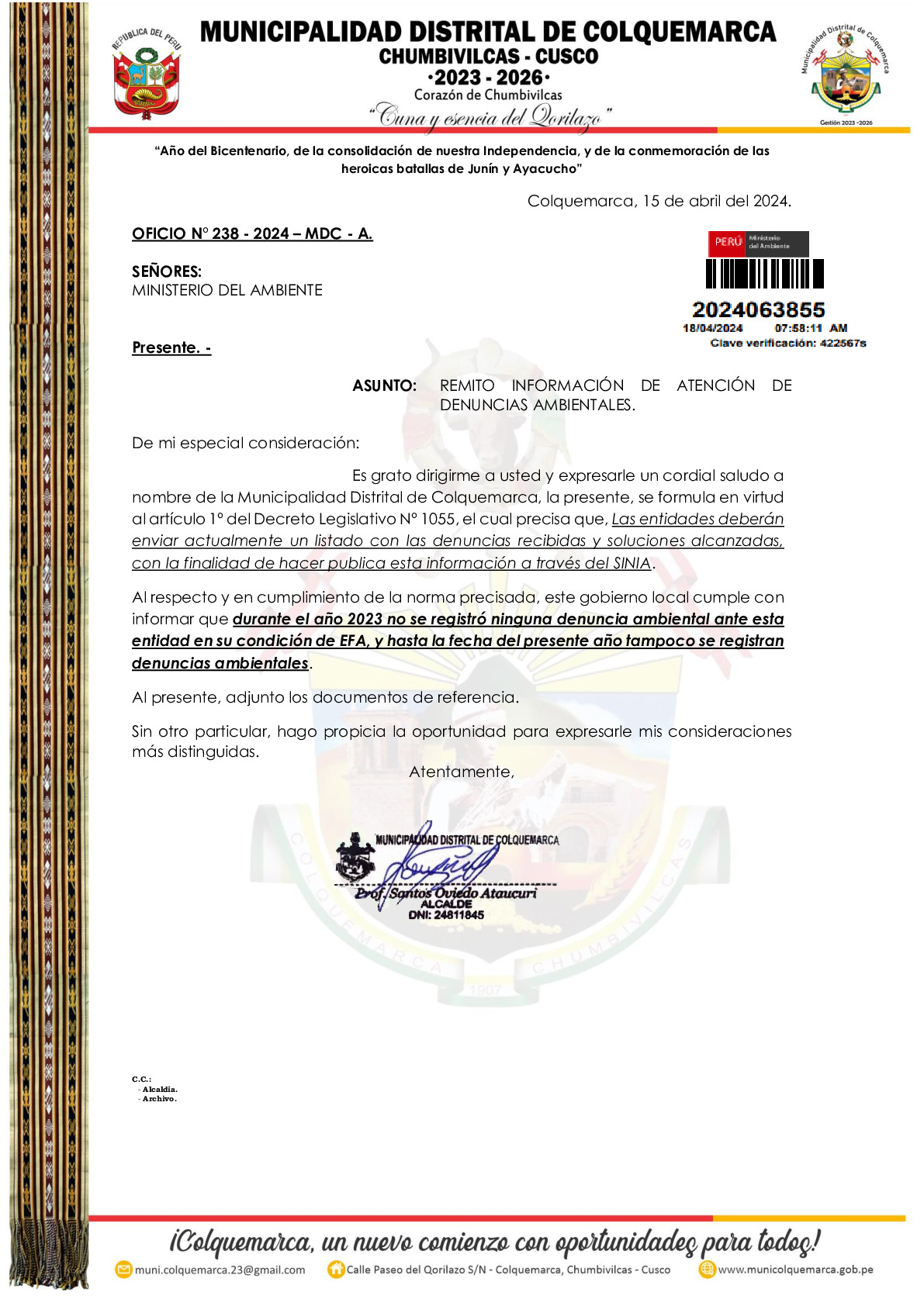 Presentación de denuncias ambientales 2023 de la Municipalidad Distrital de Colquemarca