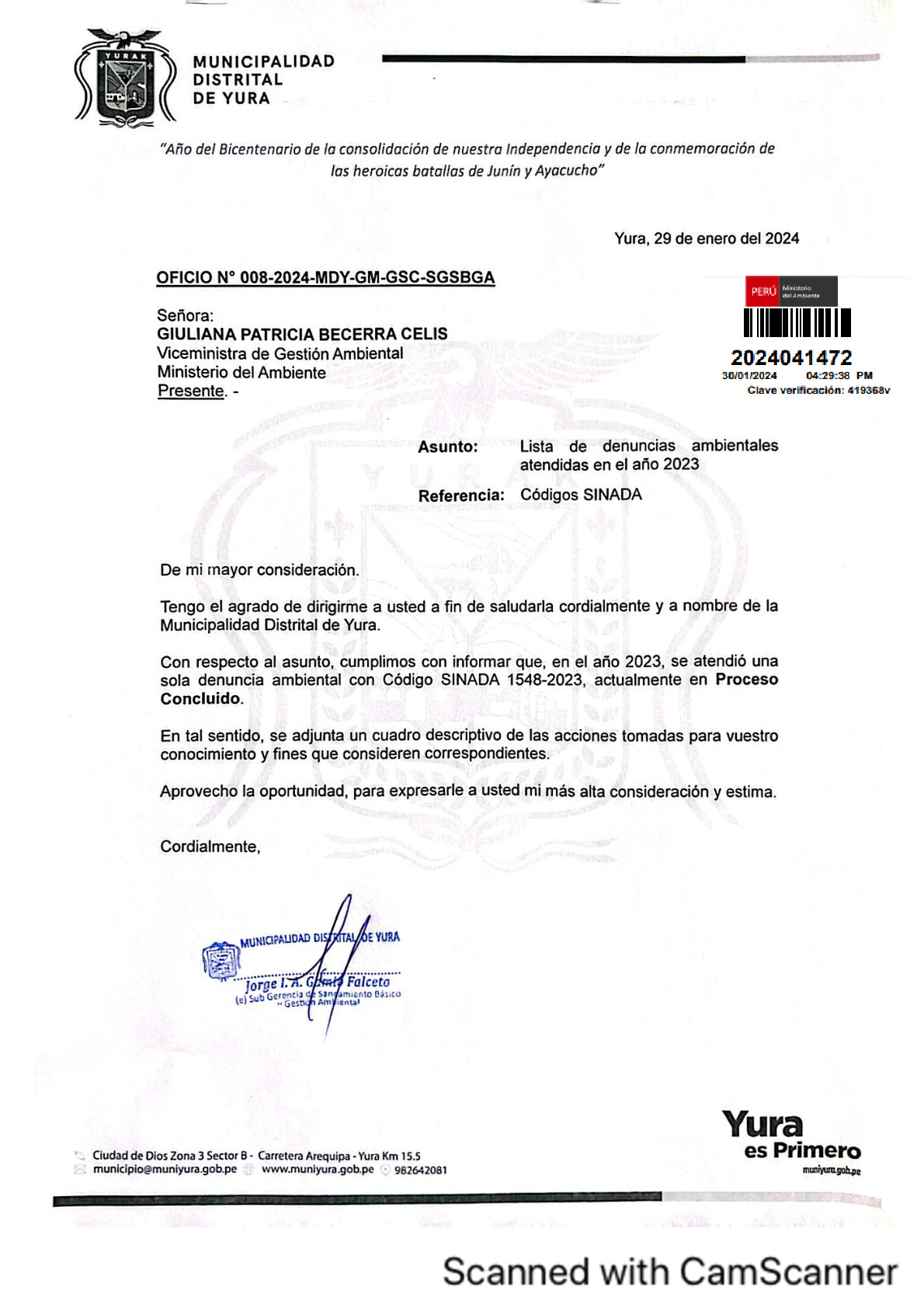 Presentación de denuncias ambientales 2023 de la Municipalidad Distrital de Yura