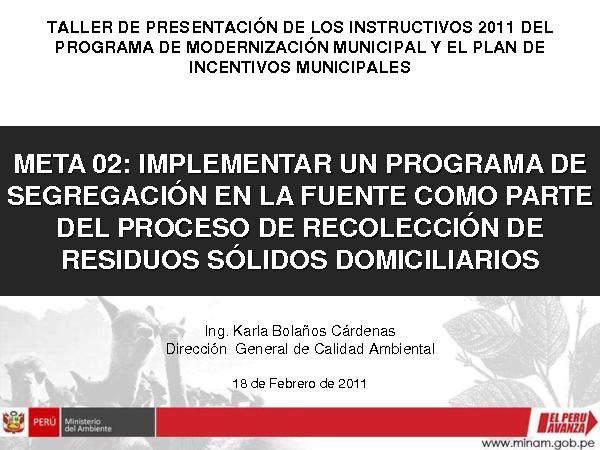 Esta presentación se llevó a cabo en el Taller de Capacitación, Validación e Implementación de Instrumentos de Gestión Integral de Residuos Sólidos en Gobiernos Locales de la Región La Libertad, en febrero del 2011 que representantes del Ministerio del Ambiente, vienen desarrollando por diversas ciudades del país.