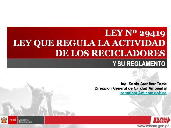 Presentación: Ley N° 29419. Ley que Regula la Actividad de los Recicladores y su Reglamento