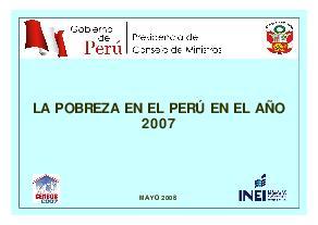 Presentación elaborada por el INEI en base al censo del población y vivienda del 2007. Se tratan los temas siguientes: Enfoques de la pobreza, principios de la medición de la pobreza, esquema de clasificación de la población según línea de pobreza, valores de las líneas de pobreza y pobreza extrema, 2004 -2007, indicadores de brecha y severidad de la pobreza, estimación de la pobreza y pobreza extrema con información anual.